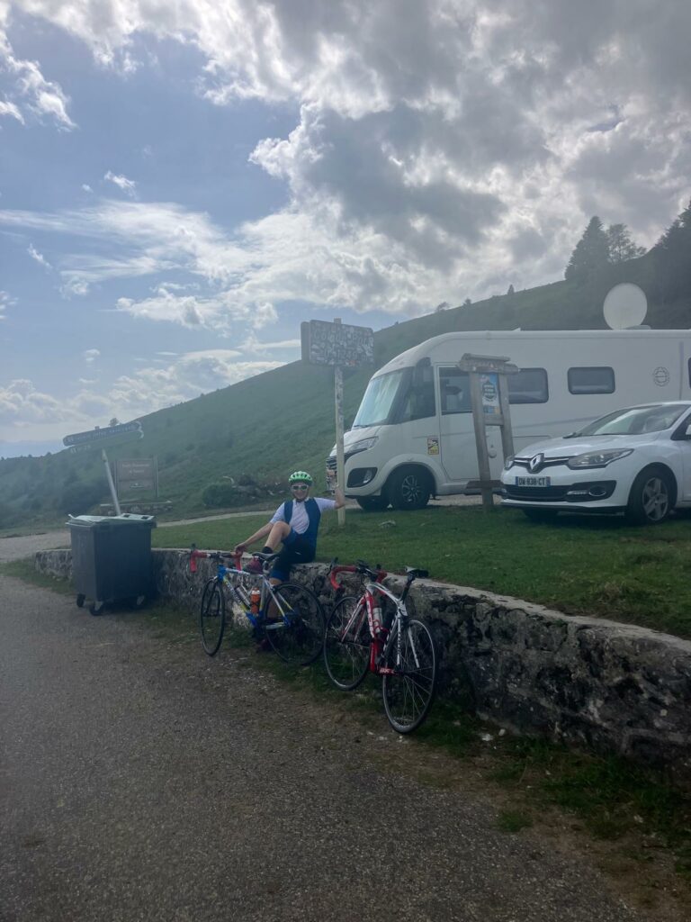 Étirements doux sur le parking du col, avant de redescendre.