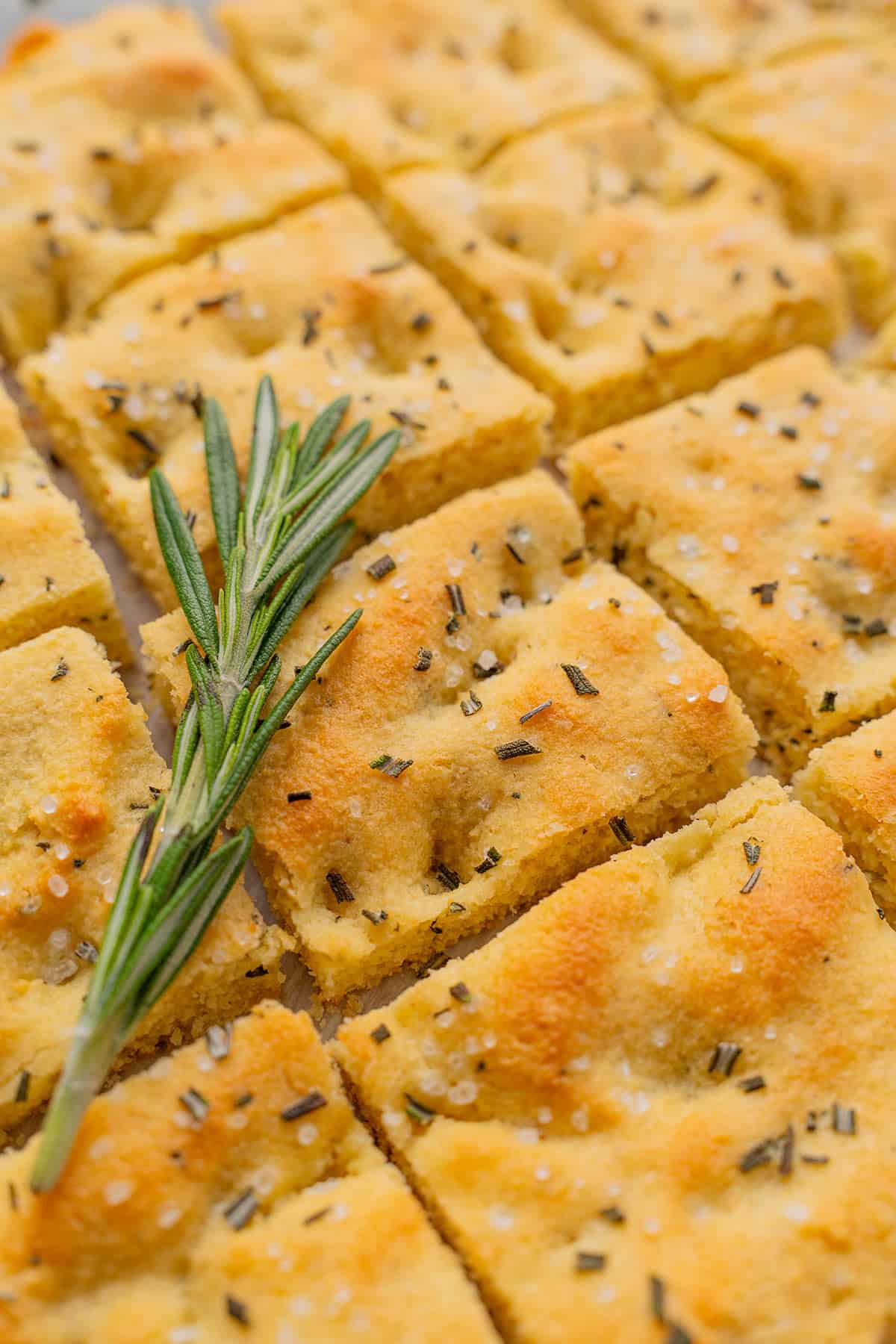 - Faire des empreintes avec les doigts, arroser d’un filet d’huile d’olive, parsemer d’herbes et de fleur de sel.