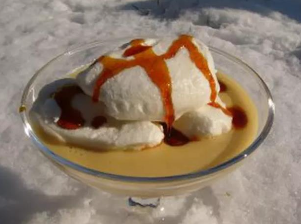 - Verser la crème anglaise froide dans des ramequins, déposer les blancs pochés et napper de caramel.